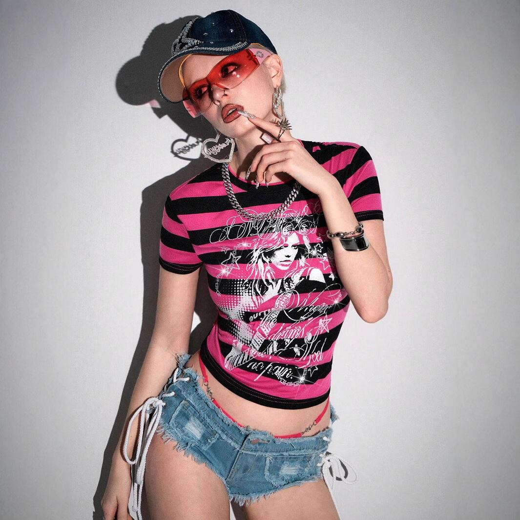 この「夏のストライプのプリントギャルファッション」を着用することで、レトロな雰囲気を楽しみながら、あなた自身の個性を引き立てる魅力的なコーディネートが実現できるでしょう!