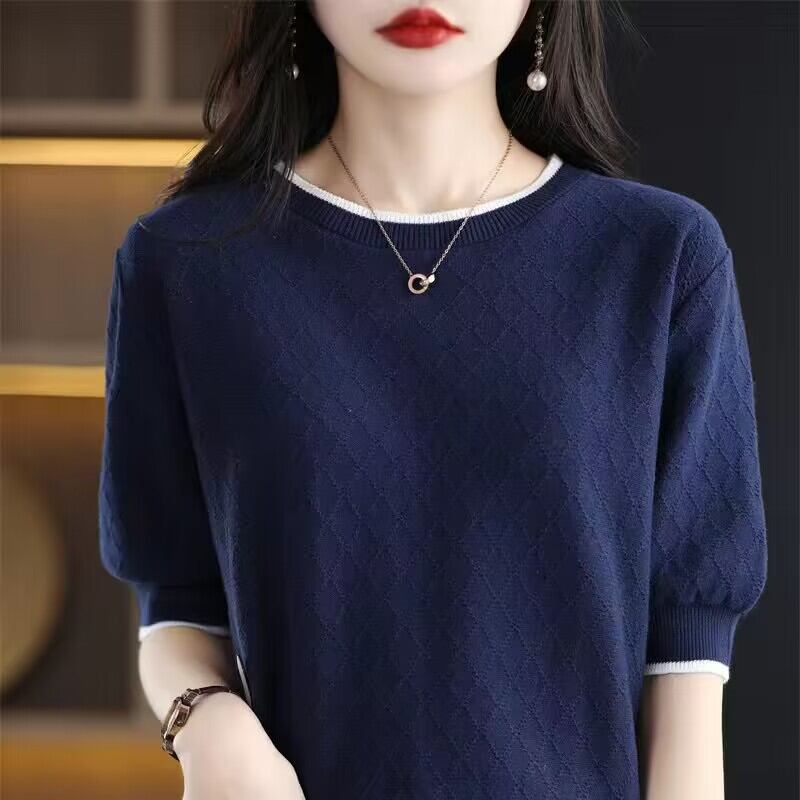 心地よい着用感と新鮮なデザインが魅力の「新色のニットの丸首の半袖Tシャツ」を手に入れて、あなたのスタイルを一段と引き立ててみませんか?