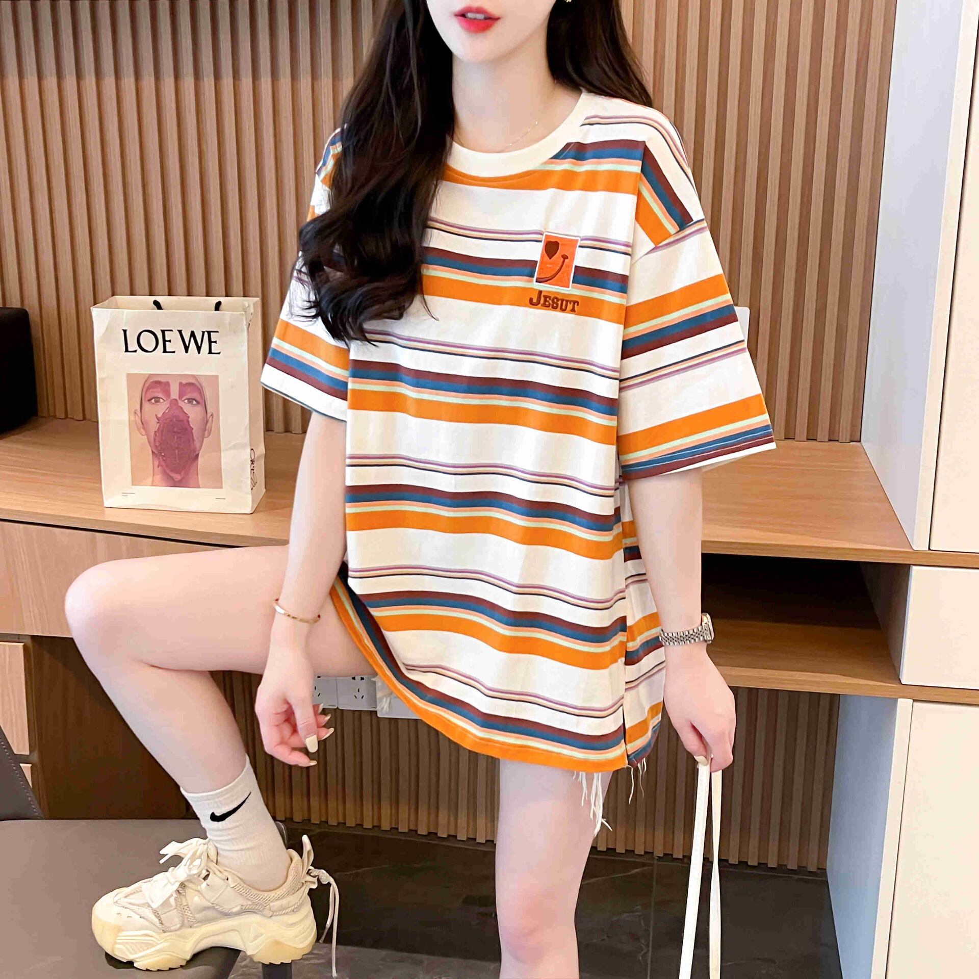 このアイテムは、柔らかな素材を使用したルーズフィットデザインが特徴で、リラックスした雰囲気を持ちながら、あなたの個性を引き立てることができます。丸襟とカラーストライプのデザインが夏らしい爽やかさを演出し、普段使いや特別な日にもぴったりの一着です!