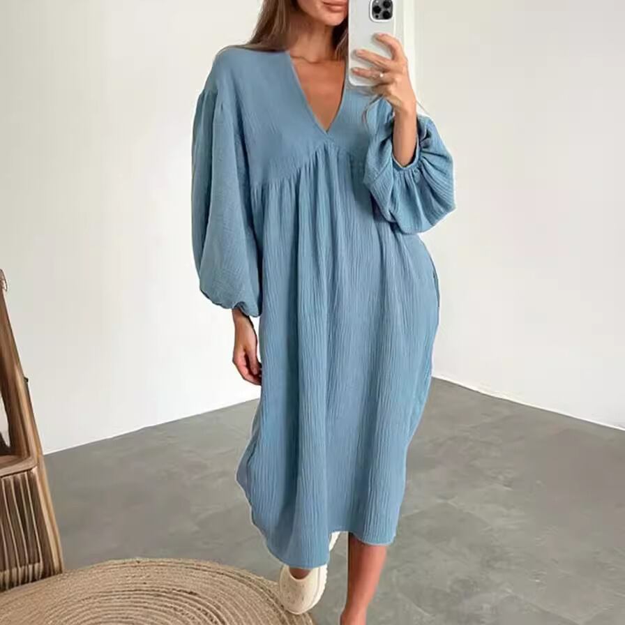 このアイテムは、Vネックが特徴的な長袖ワンピースで、ポケット付きのデザインが実用性を兼ね備えています。ゆったりしたシルエットにより、リラックスした雰囲気を演出しつつ、オシャレさも忘れません。様々なシーンで活躍し、あなたのファッションセンスを引き立てること間違いなしです!