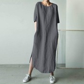 心躍るスタイルとリラックスした着心地が楽しめる「ラウンドネック半袖サイドスリット・コットンとリネンのゆったりワンピース」で、特別な瞬間をお楽しみください!