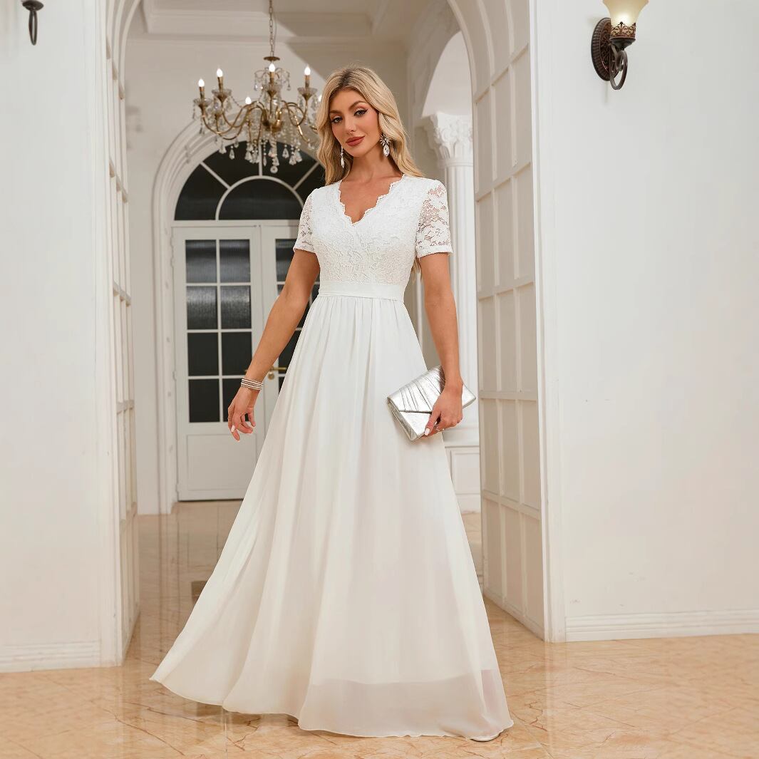 心躍るスタイルと優雅さが詰まった「欧米のレースステッチ・シフォンV ネックウェディングドレス」で、特別な日を華やかに演出しましょう!