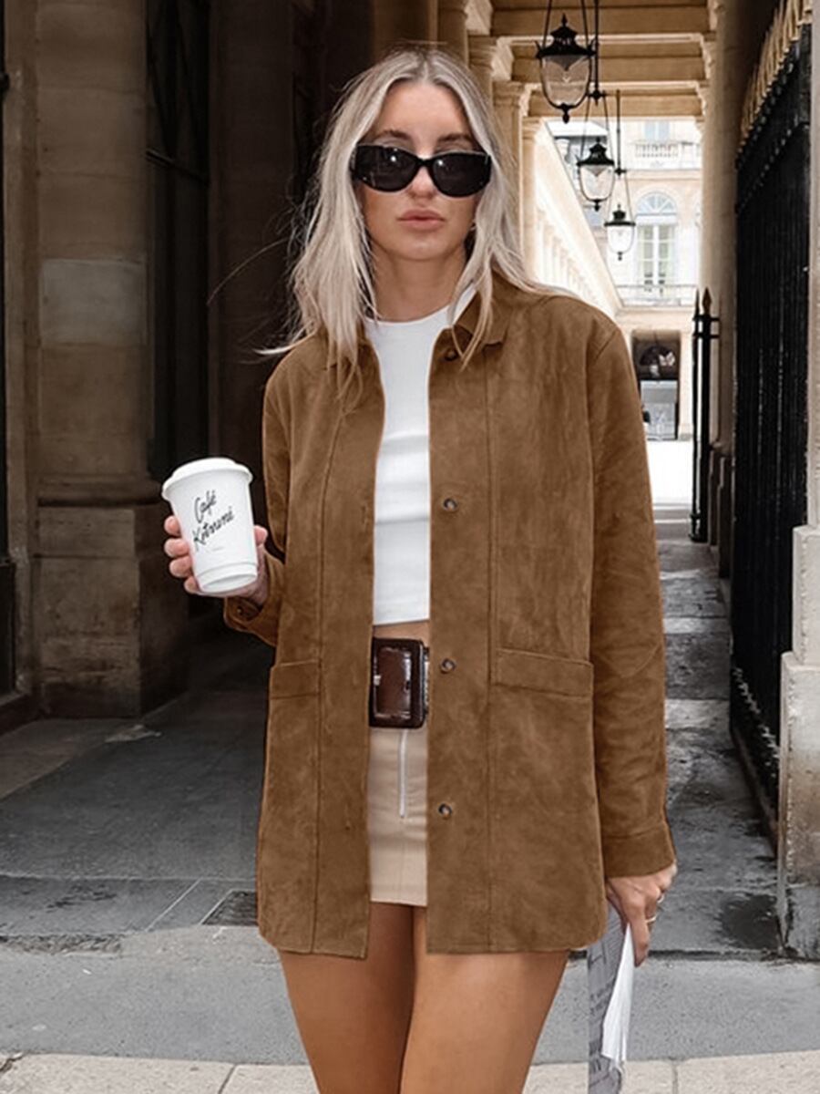 このスエードコートは、秋冬にぴったりな温かみのある色合いと柔らかな質感が特徴で、スタイリッシュな雰囲気を演出します! シンプルでありながら、特別感のあるシルエットが、あなたの魅力を引き立て、さまざまなコーディネートに対応します。このコートが、あなたのデイリースタイルを新たに彩ります!