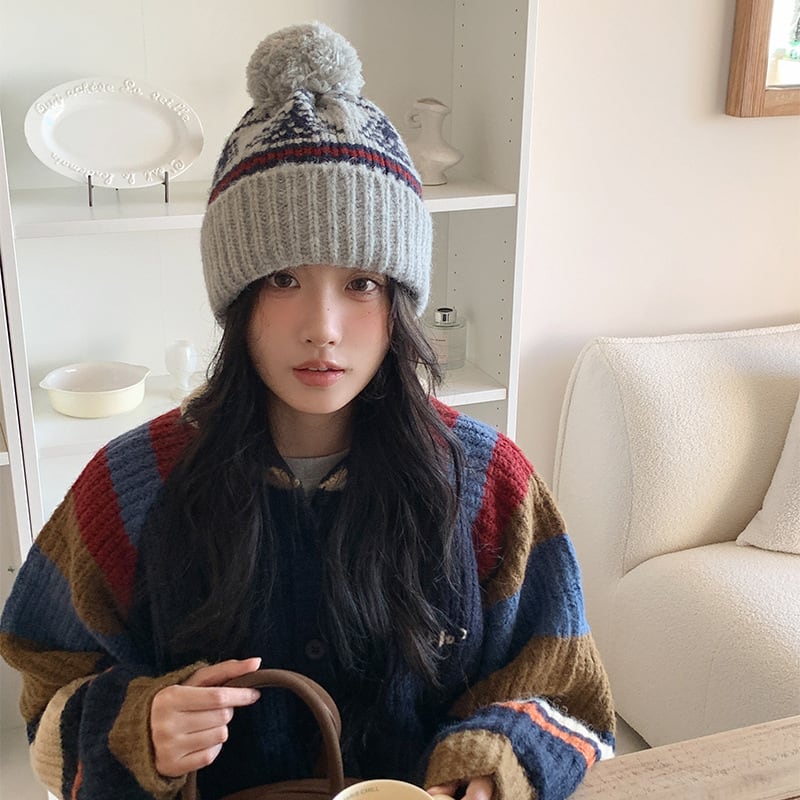 5197 フェア島風球ニット帽・厚手保温耳保護毛糸帽-