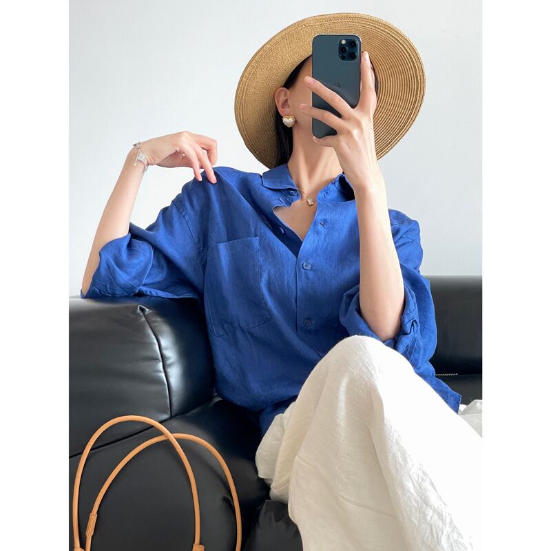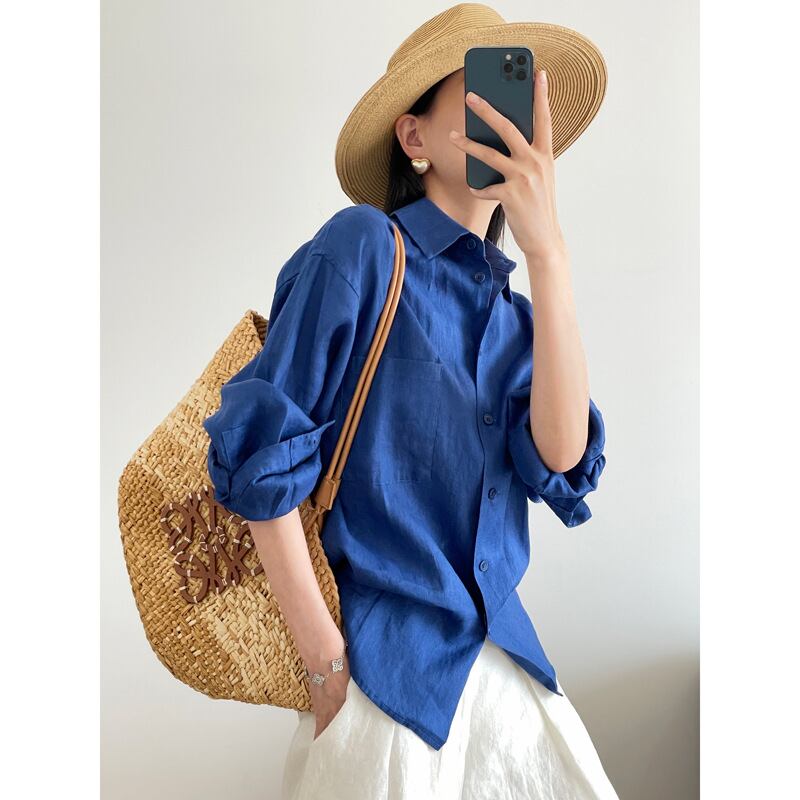 **この春夏にぴったりな「クラインブルーリネン長袖シャツ・ゆったりレイジースタイル高級トップス」で、リラックスしたスタイリッシュなコーディネートを楽しみましょう!**